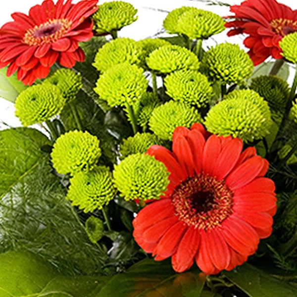 Стильно подобранная цветовая гамма и уникальный коллаж цветов! Композиция из гербер, хризантем и декоративной зелени, действительно универсален! Букет удивит как солидного юбиляра, так и любимого артиста. И, конечно же, будет приятным сюрпризом на первом свидании и станет отличным утренним подарком любимой, который разбудит ее, подарив превосходное настроение.