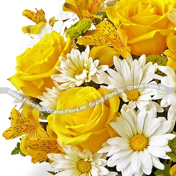 Яркая композиция, состоящая из белых кустовых и зеленых хризантем, желтых роз и альстромерий, наверняка поднимет настроение всем вокруг.