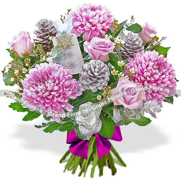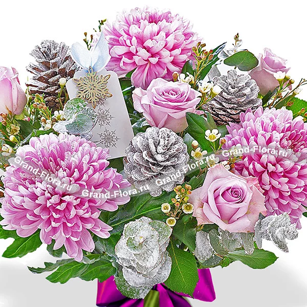 ДЕЛЮКС: хризантема одноголовая фиолетовая - 7 шт., роза Аква - 6 шт., эвкалипт декорированный серебром) - 4 шт., рускус - 4 шт., шишки (декорированные серебром) - 3 шт., бант фиолетовый.