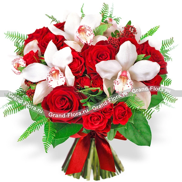 Страстное сочетание красных роз и орхидеи непременно подчеркнет красоту и безупречный вкус Вашей любимой женщины!