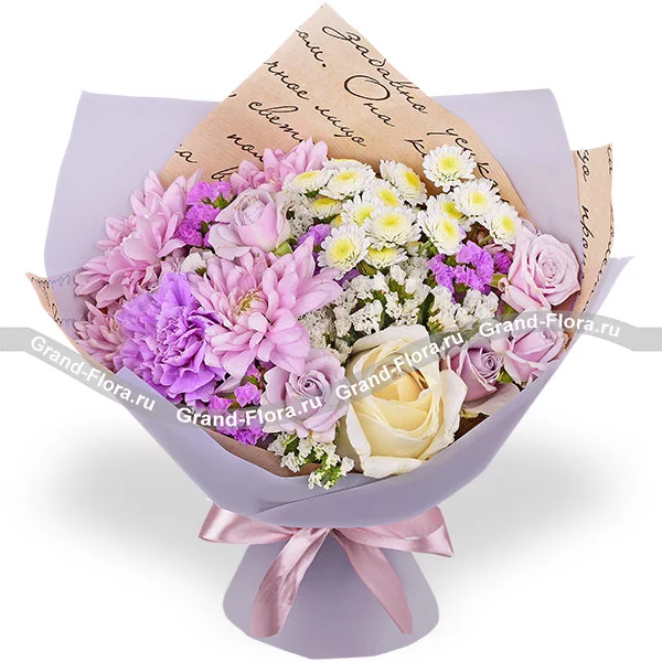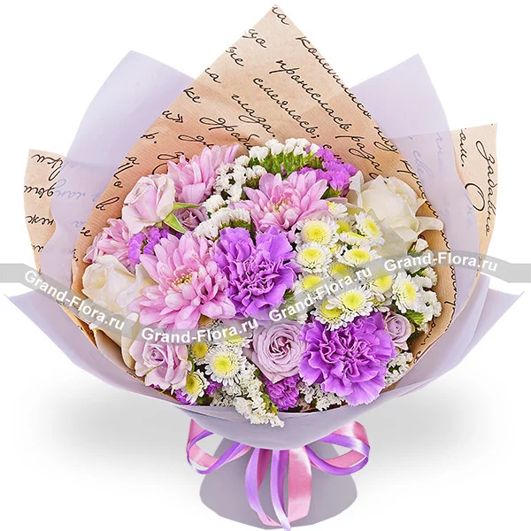 Люкс: роза белая - 3 шт., роза кустовая фиолетовая - 2 шт., гвоздика фиолетовая - 4 шт., хризантема сантини - 2 шт., хризантема кустовая ромашковая фиолетовая - 4 шт., статица, упаковка, лента. Примерный размер: 40Х40 см.
