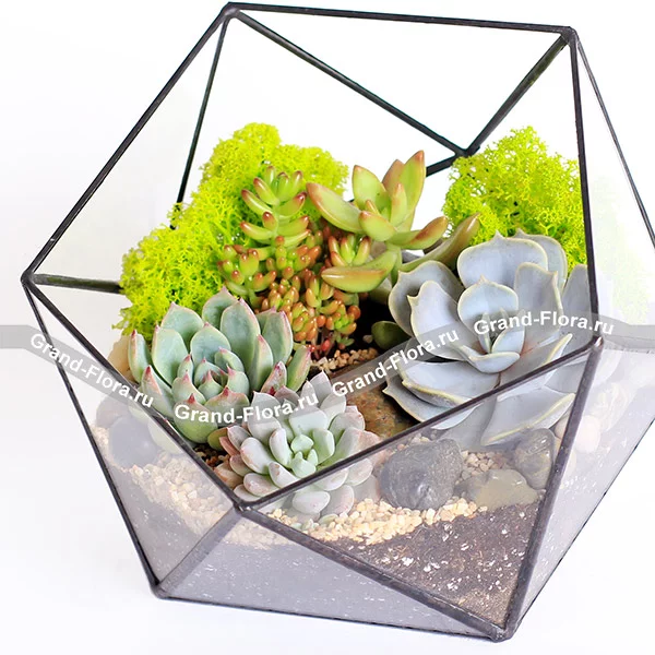 Флорариум "Краски лета" - это прекрасное сочетание несколько видов ярких суккулентов в геометрической вазе ручной работы. Такая композиция не оставит равнодушными ваших родных и близких, а цветение суккулентов весной вызовет восторг и восхищение.
