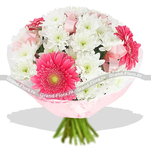 Стандартный: хризантема кустовая белая - 5 шт., гербера розовая - 3 шт., фетр розовый, лента.