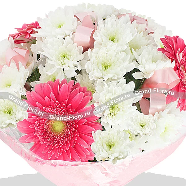 ДЕЛЮКС: хризантема кустовая белая - 11 шт., гербера розовая - 7 шт., фетр розовый, лента.
